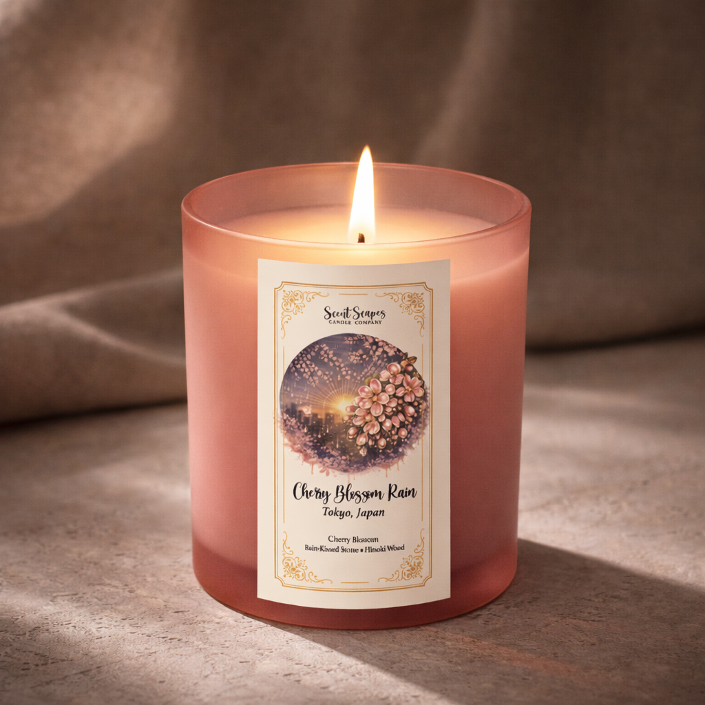 Spring drapes itself over Tokyo as rain falls like glittering musical notes across delicate cherry blossoms, sending a soft shimmer through the cool, fragrant air. Along the rain-polished concrete paths of the city, paper lanterns glow against wet stone, while the gentle steam of green tea lingers in quiet comfort beside the woody calm of hinoki — a warm pause amid drifting petals and steady rain.
